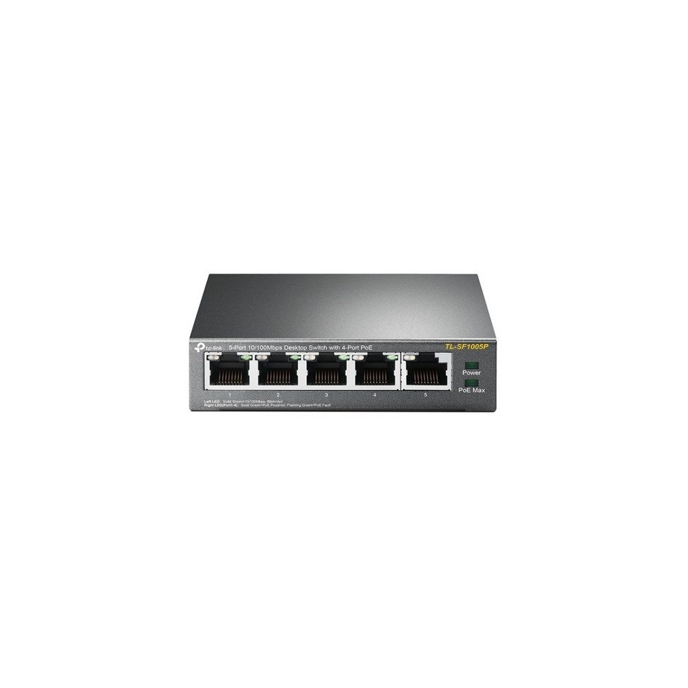 Switch PoE de escritorio de 8 puertos a 10/100Mbps, que incluyen 4 puertos PoE. 57 Watts de presupuesto de potencia., caja de acerot. El TL-SF1005P se trata de un switch de 5 puertos 10/100Mbps no gestionable, luego no requiere de coonfiguración, y proporciona 4 puertos PoE (Energía sobre Ethernet). Detecta y suministra energía eléctrica automáticamenteand a aquellos dispositivos compatibles con el standard IEEE 802.3af. En este caso, la energía eléctrica es transmitida conjuntamente con los datos vía cable ethernet proporcionando la expansión de su red hacia zonas sin cables eléctricos o enchufes, donde usted desea instalar dispositivos como Puntos de Acceso, Cámaras IP o Teléfonos IP, etc.